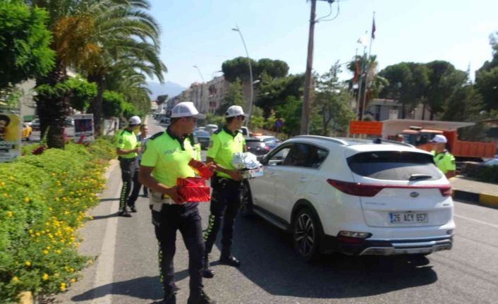 Muğla’nın Marmaris ilçesine giriş noktasında Trafik polisleri ilçeye giren araçları emniyet kemerini takmaları konusunda uyarıp, bayramlarını kutlayıp çikolata ve çocuklara hediyeler dağıttı.