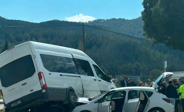 Menteşe Marmaris karayolu Ula girişindeki kavşakta resmi araç ile özel otomobilin karıştığı kazada otomobil minibüsün altına girdi.