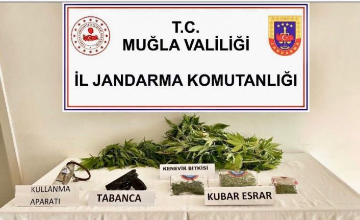 Bodrum İlçe Jandarma Komutanlığınca yapılan istihbari çalışmalar sonucu, Güvercinlik Mahallesinde ikamet eden N.A. isimli şahsın uyuşturucu madde ticareti yaptığı bilgisi alındı. Dün Bodrum İlçe Jandarma ekiplerince şahsın ikametine operasyon düzenlendi. İkamette yapılan aramada, bir miktar kubar esrar, 10 kök kenevir bitkisi, 1 adet uyuşturucu madde kullanma aparatı ve 1 adet 9 mm çapında ruhsatsız tabanca ele geçirildi. N.A., “Uyuşturucu Madde İmal ve Ticareti” suçundan gözaltına alınırken Bodrum Cumhuriyet Başsavcılığınca olayla ilgili soruşturma başlatıldı.
