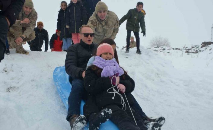 Muş’un Bulanık Kaymakamlığı, sosyal sorumluluk ve çocuk odaklı projelerine bir yenisini daha ekleyerek ilçede örnek bir etkinliğe imza attı. Bulanık İlçe Jandarma Komutanlığı bünyesinde oluşturulan özel alanda düzenlenen kış etkinliğinde çocuklar, jandarma personeliyle birlikte kızak kayarak doyasıya eğlendi. Soğuk kış günleri, çocukların neşesiyle adeta şenlik havasına büründü. Bulanık İlçe kaymakamı Ömer Övünç Koşansu ve askerler çocukları kucaklarına alarak karda kızak keyfi yaşattılar çocuklara.