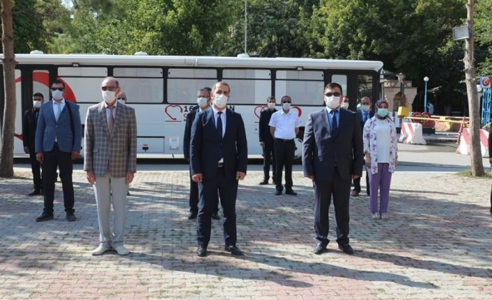 Hükümet Konağı önünde bulunan Atatürk Anıtı’na İlçe Milli Eğitim Müdürü Yalçın Tunçel tarafından çelenk sunulmasıyla başlayan tören, saygı duruşunda bulunulması ve İstiklal Marşı’nın okunmasıyla devam etti.