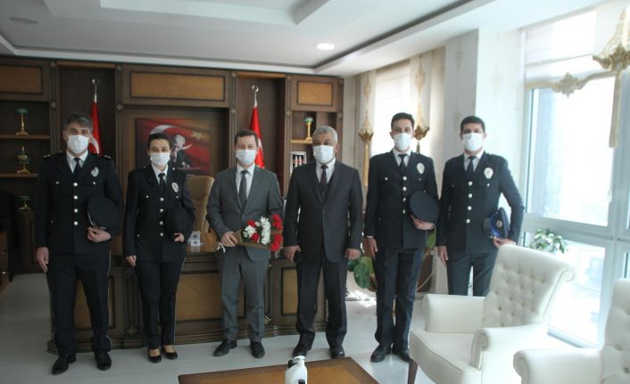 Muş’un Malazgirt İlçe Emniyet Müdürü İlker Ekşi ile beraberindeki polisler, Türk Polis Teşkilatının 176. kuruluş yıldönümü nedeniyle Kaymakam Yiğit Yaşar Demirer’i makamında ziyaret etti.