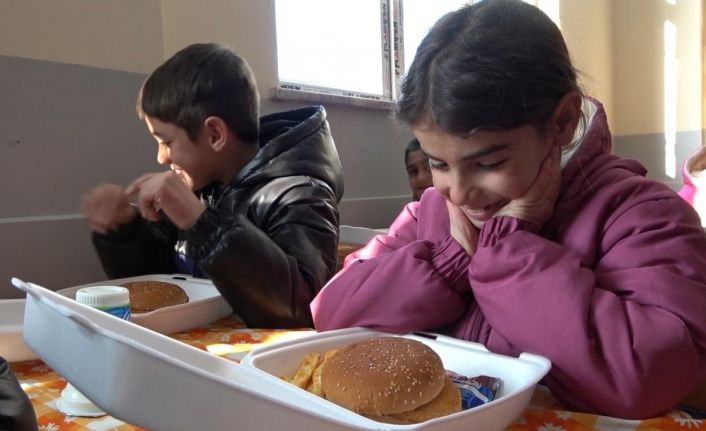 Muş’a 50 kilometre uzaklıktaki Gündoğan köyünde yaşayan çocuklar, hayatlarında ilk kez hamburger yedi.