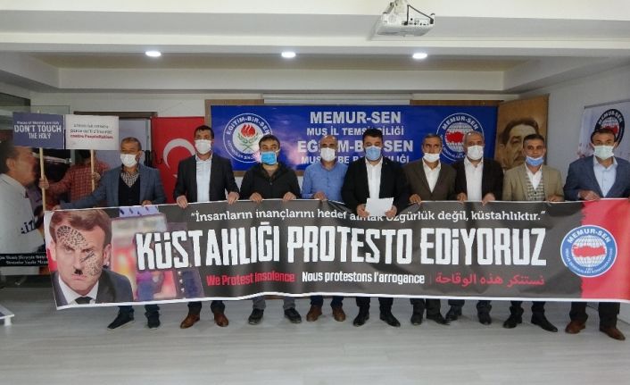 Peygamberim Efendimize hakaret eden karikatürleri Fransa’da kamu binalarına yansıtan Fransa Cumhurbaşkanı Macron, İslam karşıtlığını tırmandırmaya devam ederken, Memur-Sen de ‘İnsanların inançlarını hedef almak özgürlük değil, küstahlıktır’ diyerek Fransa’yı ve Macron’u protesto etti. Sendika binasında gerçekleştirilen basın açıklamasında konuşan Memur-Sen ve Eğitim-Bir-Sen Muş İl Başkanı Mahir Barışan, inançlarını ve değerlerini koruyacaklarını söyledi. Fransa’yı sömürgenin merkezi olarak tanımlayan Başkan Barışan, "Sömürgenin merkezlerinden olan Fransa Cumhurbaşkanı Emanuel Macron, son birkaç zamandır cinnete esir politikalarına bir yenisini ekleyerek, insanlığa rahmet olarak gönderilen, hatem-ül enbiya Hazreti Muhammed Mustafa’ya ilişkin sözde karikatürlere fikir özgürlüğü adına sahip çıkması ve Müslümanları aşağılamasını telin etmek için burada toplandık" dedi.