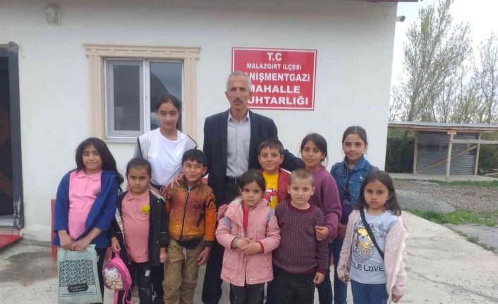 Muş’un Malazgirt ilçesi Danışmentgazi Mahallesi Muhtarlığına gelen çocuklar, muhtar Hasan Başaran tarafından kapıda karşılanarak ikramda bulundu.
