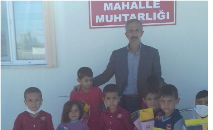 Muş’un Malazgirt ilçesindeki Danışmentgazi Mahallesi Muhtarı ve 1071 Bir Umutta Sen Ol Derneği (BUSODER) Başkanı Hasan Başaran, muhtarlığı ziyarete gelen öğrencilere kırtasiye yardımında bulunuyor.