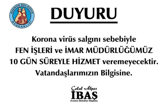 Avanos Belediyesi koronavirüs salgını nedeniyle iki müdürlüğünde 10 gün süreyle hizmet verilemeyeceğini duyurdu.