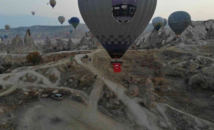Türkiye’nin en önemli turizm merkezlerinden biri olan Kapadokya’da, Cumhuriyetin kuruluşunun 98. yıldönümü dolayısıyla çok sayıda sıcak hava balonunun bu sabahki uçuşlarında sepetlerine Türk bayrağı ve Atatürk posteri asıldı.