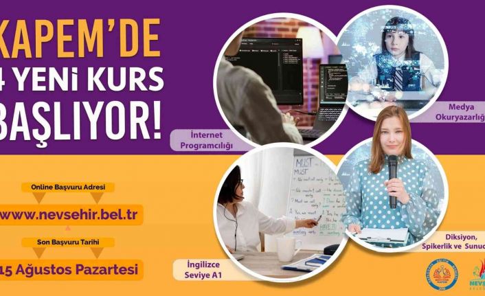 Her yıl açtığı mesleki, kişisel beceri ve hobi kursları ile on binlerce kişiye ücretsiz eğitimler veren KAPEM, yeni dönemde 4 yeni kurs daha açacak. Paşakonağı içerisinde faaliyetlerini sürdüren KAPEM’de açılacak olan Diksiyon Spikerlik ve Sunuculuk, Medya Okuryazarlığı, İngilizce Seviye A1 ve İnternet Programcılığı kursları için kayıtlar başladı. Ücretsiz olarak hafta içi ve hafta sonu düzenlenecek olan kurslara katılmak isteyenler 15 Ağustos tarihine kadar Paşakonağ’ındaki Nevşehir Belediyesi Gençlik ve Spor Hizmetleri Müdürlüğü’ne şahsen başvurabilecekleri gibi www.nevsehir.bel.tr adresindeki hızlı menü içerisinde bulunan KAPEM Kurs Kayıt sekmesinden online olarak kayıtlarını yaptırabilecek.