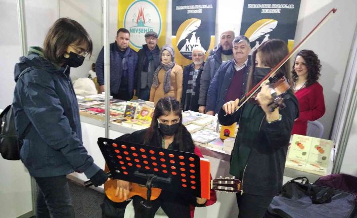Nevşehir Belediyesi Kültür ve Sosyal İşler Müdürlüğü tarafından düzenlenen Kitap Fuarı devam ediyor. Türkiye’nin seçkin yayınevlerinin açtığı stantlarla birlikte ünlü yazar ve şairleri Nevşehirliler ile buluşturan fuar alanında Kapadokya Yazarlar Derneği (KYD) standını ziyaret eden Nevşehir Demet Sezen Güzel Sanatlar Lisesi öğrencileri Nurdan Andaç ve İlay Akpınar kitapseverler için canlı müzik performansı sergiledi. Keman ve gitar eşliğinde çalınan müziği işiten kitapseverler KYD standının etrafını doldurdu. Müzik performansı sesin daha iyi işitilmesi için mikrofon aracılığıyla fuar alanındaki hoparlörden canlı olarak yayınlandı. Nurdan Andaç ve İlay Akpınar tarafından sergilenen muhteşem performans kitapseverler tarafından uzun süre alkışlandı.