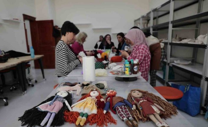 Nevşehir Belediyesi Kadın ve Aile Hizmetleri Müdürlüğü eğitmenleri ve kursiyerleri, depremzede çocuklar için bez bebek yapıyor.