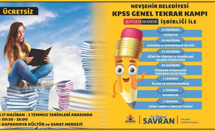 Nevşehir Belediyesi Gençlik ve Spor Hizmetleri Müdürlüğü tarafından memur adayları için 27 Haziran-3 Temmuz 2022 tarihleri arasında ücretsiz KPSS Genel Tekrar Kampı düzenlenecek.