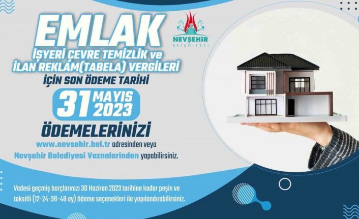 Nevşehir Belediyesi Mali Hizmetler Müdürlüğü, 2023 Yılı Emlak, Çevre Temizlik ve İlan Reklam Vergilerinin ilk taksit ödemelerinin son gününün 31 Mayıs 2023 Çarşamba günü olduğunu hatırlattı.