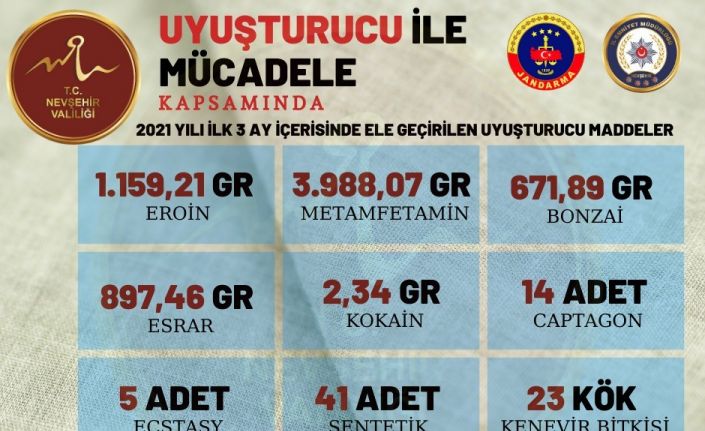 Nevşehir Valiliği tarafından yapılan açıklamada yılın ilk 3 ayında Emniyet ve jandarma ekipleri tarafından 6 kilogram 915 gram uyuşturucu ele geçirildi.