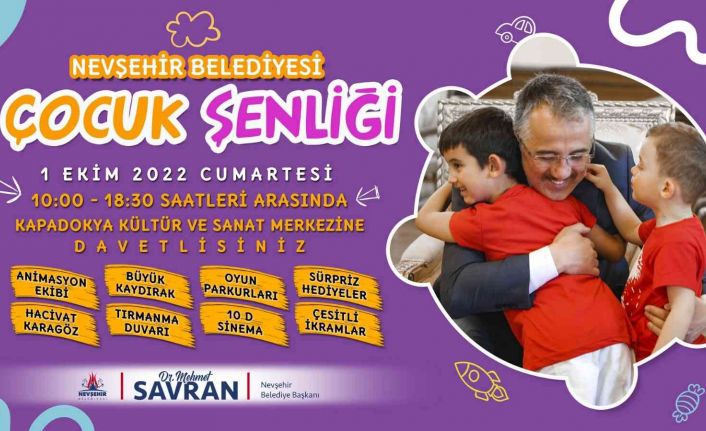 Nevşehir Belediyesi Kültür ve Sosyal İşler Müdürlüğü tarafından 1 Ekim 2022 Cumartesi günü Saat: 10.00 ile 18.30 saatleri arasında Kapadokya Kültür ve Sanat Merkezi bahçesinde Çocuk Şenliği düzenlenecek. Birbirinden eğlenceli aktivitelerin düzenleneceği çocuk şenliğinde Nevşehirli çocuklar doyasıya eğlenerek aileleri ile birlikte unutulmaz bir güne imza atacak. Şenlikte; Hacivat Karagöz, Akrobasi Gösterileri, 10 D Mobil Sinema, Dart, Basketbol ve Futbol Oyun Parkurları, Tırmanma Duvarı, Palyaço, Sokak Oyunları, Maskot gibi aktiviteler yer alacak.
