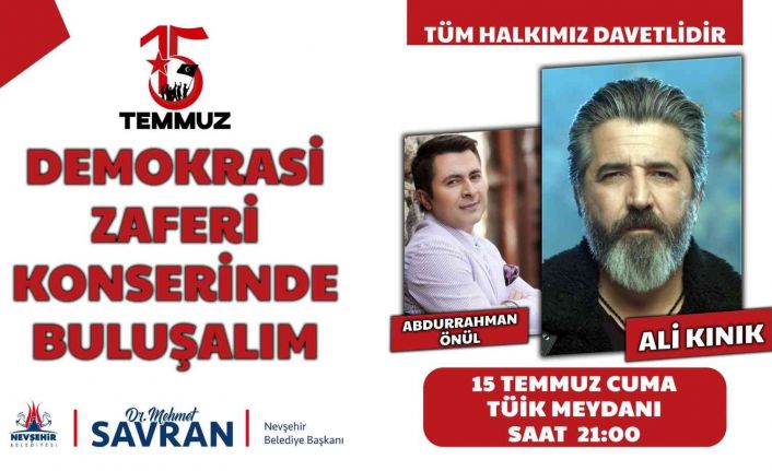 15 Temmuz Demokrasi ve Milli Birlik Günü dolayısıyla Nevşehir Belediyesi tarafından ‘Demokrasi Zaferi Konseri’ düzenlenecek. Konserde İlahi Sanatçısı Abdurrahman Önül ve ünlü sanatçı Ali Kınık sahne alacak.