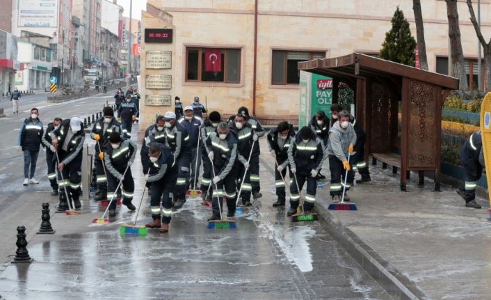 Fen İşleri Müdürlüğü, Park ve Bahçeler Müdürlüğü, Temizlik İşleri Müdürlüğü, İtfaiye ve Zabıta Müdürlüğü ekiplerinin katılımı ile gerçekleştirilen çalışmada cadde ve sokakları köpüklü su ile yıkayan ekipler daha sonra ilaçlama yaptı.