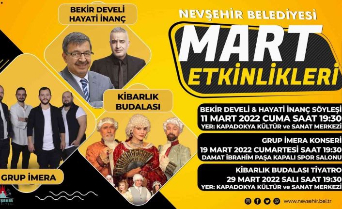 Nevşehir Belediyesi tarafından düzenlenen Kültür ve Sanat Etkinlikleri; Mart ayında konser, tiyatro ve söyleşilerle devam edecek.