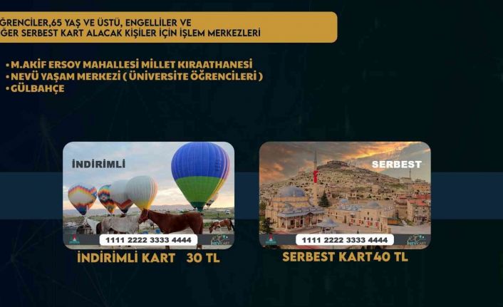 "Önümüzdeki günlerde kullanılmaya başlanacak olan sistem için işlem merkezlerinde oluşabilecek yoğunluğu azaltmak ve vatandaşlarımızın kısa sürede kartlara ulaşmasını sağlamak amacıyla 12.10.2022 Çarşamba gününden itibaren hizmet vermeye başlayacak. İndirimli ve Serbest Kart alacak olan vatandaşlarımız (Engelliler, 65 yaş üstü vatandaşlar, Polis, Jandarma, Gaziler, Şehit Yakınları ve Öğrenciler) kartlarını Atatürk Bulvarı üzerindeki Gülbahçe, Mehmet Akif Ersoy Mahallesi’nde Millet Kıraathanesi ve Nevşehir Hacı Bektaş Veli Üniversitesi Yaşam Merkezi(Üniversite öğrencileri) içerisinde bulunan NEVKART İşlem Merkezlerinden alabilecekler.