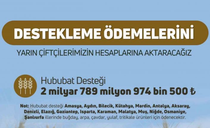 Yapılan açıklamaya göre, Türkiye genelinde toplam 2 milyar 789 milyon 974 bin 500 TL ödeme gerçekleştirilecek. Destek ödemesi; Amasya, Aydın, Bilecik, Kütahya, Mardin, Antalya, Aksaray, Denizli, Elazığ, Gaziantep, Isparta, Karaman, Malatya, Muş, Niğde, Osmaniye, Şanlıurfa illerinde buğday, arpa, çavdar, yulaf ve tritikale üretimi yapan çiftçilere yönelik olacak.