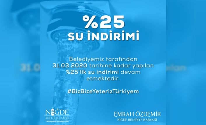 Niğde Belediyesi, korona virüsü salgınına karşı tedbir amacıyla Niğde’de evlerde ve konutlarda kullanılan su ve atık su ücretlerine yüzde 25 indirim yapılacağını açıkladı.