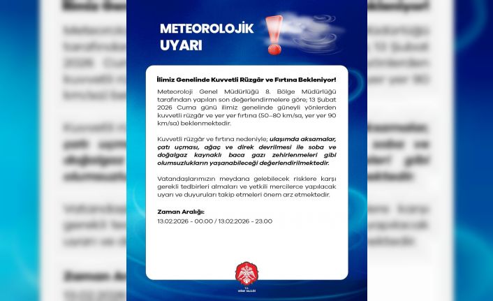 Valilikten yapılan açıklamada, vatandaşların meydana gelebilecek risklere karşı gerekli tedbirleri almaları ve yetkili merciler tarafından yapılacak uyarı ve duyuruları yakından takip etmeleri istendi. Meteorolojik uyarının 13 Şubat saat 00.00’da başlayıp aynı gün saat 23.00’te sona ermesi bekleniyor.