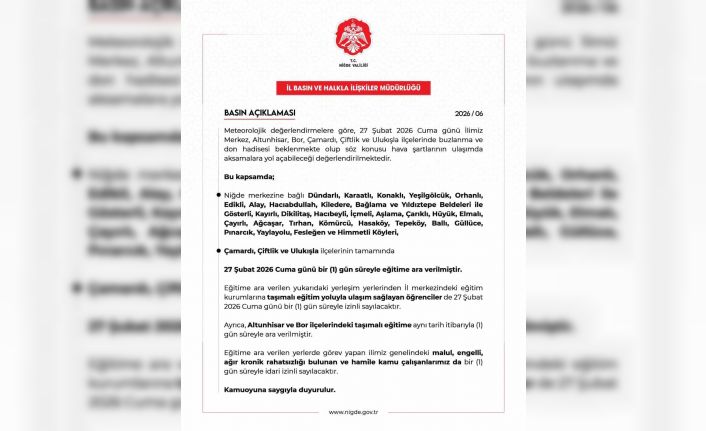 Valilikten yapılan açıklamada, "Niğde merkeze bağlı Dündarlı, Karaatlı, Konaklı, Yeşilgölcük, Orhanlı, Edikli, Alay, Hacıabdullah, Kiledere, Bağlama ve Yıldıztepe beldeleri ile Gösterli, Kayırli, Dikilitaş, Hacıbeyli, İçmeli, Aşlama, Çarıklı, Hüyük, Elmalı, Çayırlı, Ağaççar, Tırhan, Kömürcü, Hasaköy, Tepeköy, Ballı, Güllüce, Pınarcık, Yaylayolu, Fesleğen ve Himmetli Köyleri ile Çamardı, Çiftlik ve Ulukışla ilçelerinin tamamında 27 Şubat 2026 Cuma günü 1 gün süreyle eğitime ara verilmiştir. Eğitime ara verilen yukarıdaki yerleşim yerlerinden il merkezindeki eğitim kurumlarına taşımalı eğitim yoluyla ulaşım sağlayan öğrenciler de bir gün süreyle izinli sayılacaktır. Ayrıca, Altunhisar ve Bor ilçelerindeki taşımalı eğitime aynı tarih itibarıyla ara verilmiştir. Eğitime ara verilen yerlerde görev yapan ilimiz genelindeki malul, engelli, ağır kronik rahatsızlığı bulunan ve hamile kamu çalışanlarımız da bir gün süreyle idari izinli sayılacaktır" ifadelerine yer verildi.