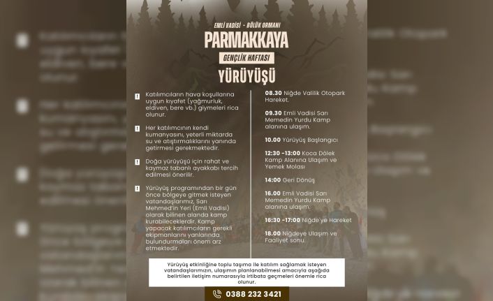 18 Mayıs 2025 Pazar günü gerçekleştirilecek olan etkinlik, Emli Vadisi - Parmakkaya rotasında doğaseverleri bir araya getirecek. Gençlik Haftası’nın ruhunu doğayla buluşturmayı hedefleyen etkinlik, 18 Mayıs Pazar günü sabah 08.30’da Niğde Valiliği otoparkından hareketle başlayacak. Emli Vadisi Sarı Memedin Yurdu Kamp Alanı’na ulaşılmasının ardından saat 10.00’da yürüyüş start alacak. Parmakkaya’nın eşsiz doğası eşliğinde yapılacak yürüyüş, katılımcılara hem spor yapma hem de doğanın tadını çıkarma fırsatı sunacak.