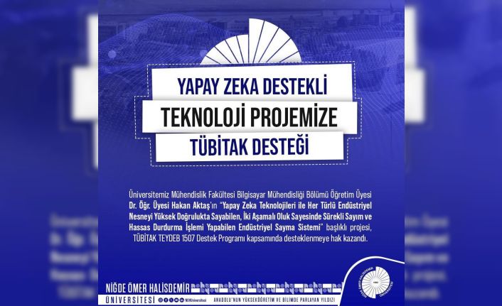 Niğde Ömer Halisdemir Üniversitesi Mühendislik Fakültesi Bilgisayar Mühendisliği Bölümü Öğretim Üyesi Dr. Öğr. Üyesi Hakan Aktaş’ın yürütücüsü olduğu ’Yapay Zeka Teknolojileri ile Her Türlü Endüstriyel Nesneyi Yüksek Doğrulukta Sayabilen, İki Aşamalı Oluk Sayesinde Sürekli Sayım ve Hassas Durdurma İşlemi Yapabilen Endüstriyel Sayma Sistemi’ isimli projesi; TÜBİTAK TEYDEB 1507 destek programı kapsamında desteklenmeye hak kazandı.