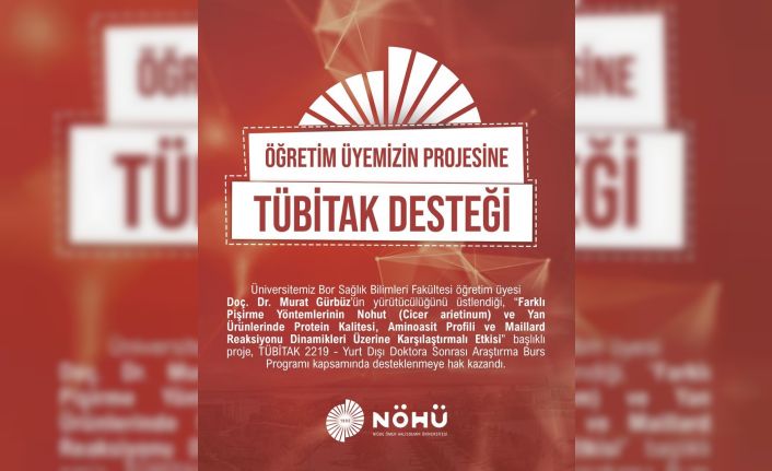 Niğde Ömer Halisdemir Üniversitesi Bor Sağlık Bilimleri Fakültesi öğretim üyesi Doç. Dr. Murat Gürbüz’ün yürütücülüğünü üstlendiği, "Farklı Pişirme Yöntemlerinin Nohut (Cicer arietinum) ve Yan Ürünlerinde Protein Kalitesi, Aminoasit Profili ve Maillard Reaksiyonu Dinamikleri Üzerine Karşılaştırmalı Etkisi" başlıklı proje, TÜBİTAK 2219-Yurt Dışı Doktora Sonrası Araştırma Burs Programı kapsamında desteklenmeye hak kazandı.