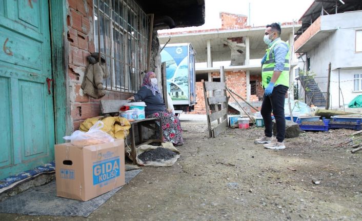 Pandemi önlemlerine uyarak gıda destek paketi dağıtımını yapan belediye ekipleri, evlerinden çıkamayan vatandaşlara gıda destek kolisini ulaştırırken salgının yayılımın önüne geçmek için hanelerini de dezenfekte ediyor.