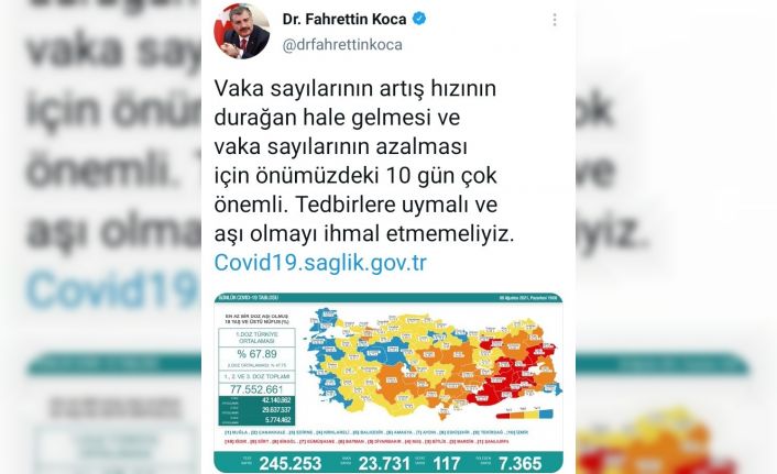 Sağlık Bakanı Dr. Fahrettin Koca, sosyal medya hesabından yaptığı paylaşımda, "Vaka sayılarının artış hızının durağan hale gelmesi ve vaka sayılarının azalması için önümüzdeki 10 gün çok önemli. Tedbirlere uymalı ve aşı olmayı ihmal etmemeliyiz" ifadelerine yer verdi.