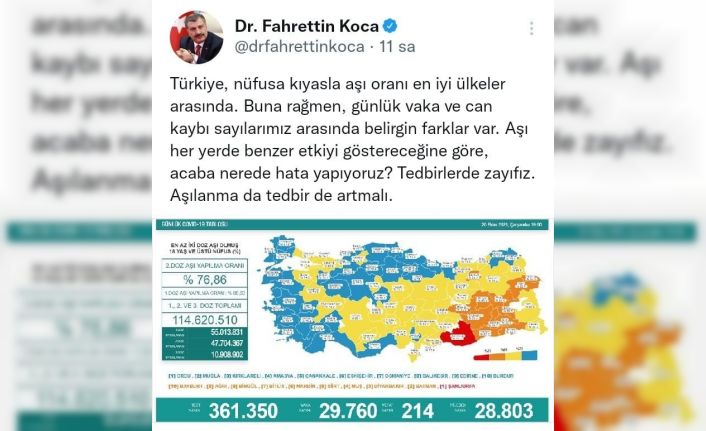 Bakan Koca, sosyal medya hesabından yaptığı paylaşımda Türkiye’nin, nüfusa kıyasla aşı oranı en iyi ülkeler arasında olduğunu söyledi. Bakan Koca paylaşımında, “Buna rağmen, günlük vaka ve can kaybı sayılarımız arasında belirgin farklar var. Aşı her yerde benzer etkiyi göstereceğine göre, acaba nerede hata yapıyoruz? Tedbirlerde zayıfız. Aşılama da tedbir de artmalı” ifadelerine yer verdi.