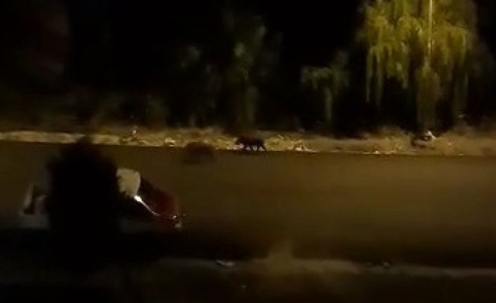 O anla ise bir vatandaşın cep telefonuyla kaydedilirken, domuz sürüsü ise ormanlık bir alana giderek gözden kayboldu.