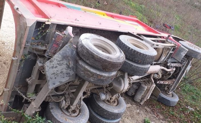 Ordu’nun Kumru ilçesinde çakıl yüklü kamyon kontrolden çıkarak yan yattı.