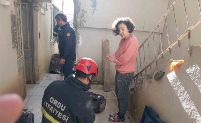 Ordu’nun Ünye ilçesinde sokak köpeklerinden kaçan kedi, sıkıştığı yerden kurtarılarak sahibine teslim edildi.