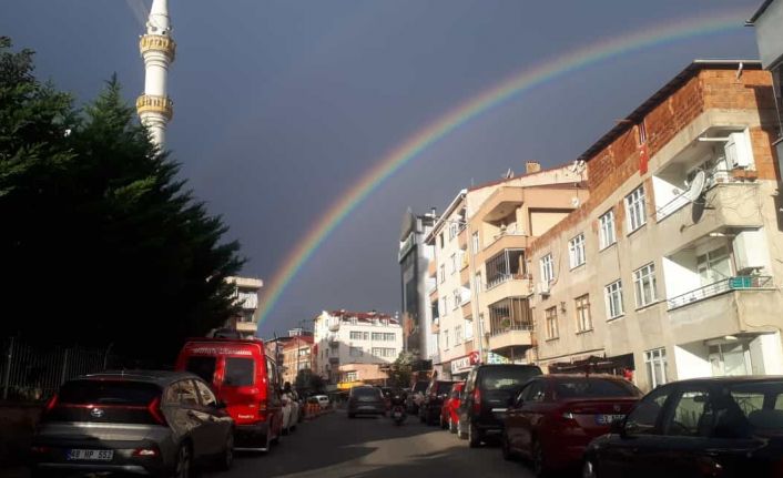 Ordu’da günlerdir aralıklarla devam eden hafif sağanak, bu gece saatlerinde etkisin devam ettirdi. Sabah saatlerinde güneşin etkisini göstermesi ile birlikte şehir merkezinde beliren gökkuşağı kartpostallık görüntü oluşturdu. Genellikle yağmur sonrası güneşin çıkmasıyla birlikte havada kalan su buharının prizmatik yansımasıyla birlikte oluştuğu bilinen gökkuşağı, vatandaşların ilgisini çekti. Kentin farklı noktalarından görülen ve vatandaşlar tarafından da fotoğraflanan gökkuşağı bir süre sonra kayboldu.