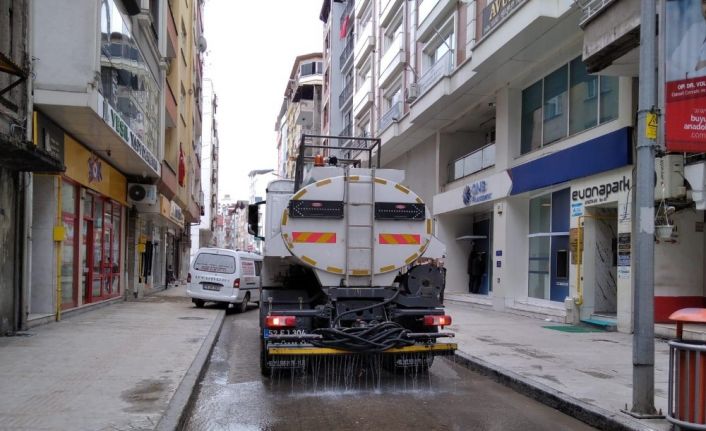 İnsanların çoğunluğunun evlerine çekildiği Ordu’da ilçelerde temizlik çalışmaları sürüyor. Altınordu, Fatsa, Ünye başta olmak üzere diğer ilçelerde de sokak ve caddeler özel katkılı dezenfeksiyon maddeleri ile yıkıyor. Ordu Büyükşehir Belediyesi Park ve Bahçeler Daire Başkanlığı dezenfeksiyon ekipleri özel içerikli dezenfekte maddeleriyle şehrin cadde ve sokaklarını yıkayarak steril hale getiriyor.