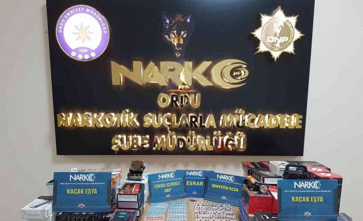 Ordu Emniyet Müdürlüğüne bağlı ekipler tarafından yapılan çalışmalarda Altınordu ilçesinde 2 şüphelinin üzerinde ve eşyalarında yapılan aramada 202 adet uyuşturucu hap, 278 adet kaçak yollarla elde edildiği değerlendirilen cinsel içerikli hap, esrar maddesi, cinsel içerikli jel, 79 adet tıraş makinesi, ampul, ses sistemi, kulaklık ve projektörden oluşan kaçak eşya ele geçirildi.