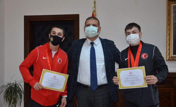 Gençler Dünya Halter Şampiyonası’nda dereceye girerek Ordu’yu gururlandıran sporcular olan Yusuf Fehmi Genç ile Melihcan Günay, Ünye Kaymakamı Ümit Hüseyin Güney tarafından ödüllendirildi.