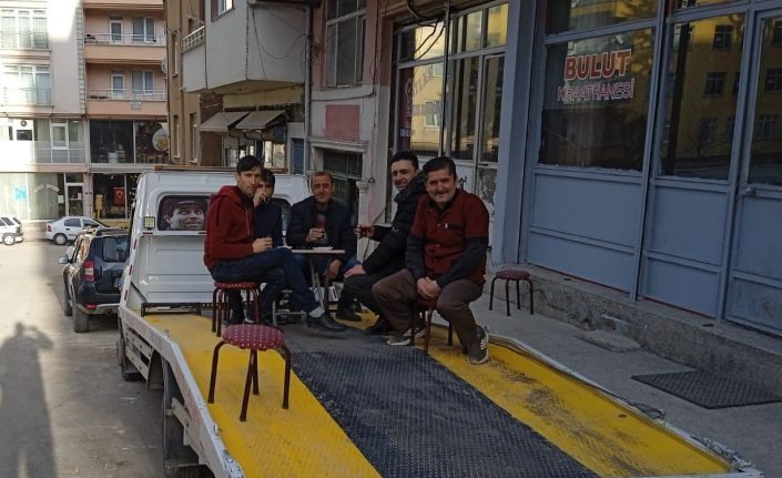 Ordu’nun Kumru ilçesinde vatandaşlar, bir kıraathanenin önüne park eden oto kurtarıcının üzerinde kurulan masada çay molası verdi.