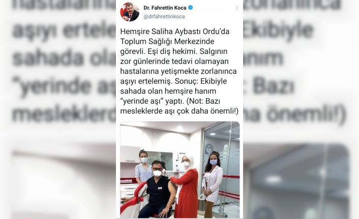 Bakan Fahrettin Koca, sosyal medya hesabından yaptığı paylaşımda, “Hemşire Saliha Aybastı Ordu’da Toplum Sağlığı Merkezinde görevli. Eşi diş hekimi. Salgının zor günlerinde tedavi olamayan hastalarına yetişmekte zorlanınca aşıyı ertelemiş. Sonuç: Ekibiyle sahada olan hemşire hanım “yerinde aşı” yaptı. (Not: Bazı mesleklerde aşı çok daha önemli!)” ifadelerine yer verdi.