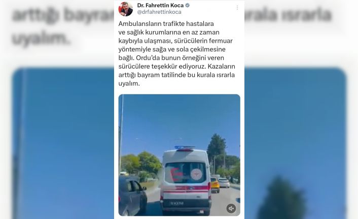 O anları sosyal medya hesaplarından paylaşan Sağlık Bakanı Fahrettin Koca, “Ambulansların trafikte hastalara ve sağlık kurumlarına en az zaman kaybıyla ulaşması, sürücülerin fermuar yöntemiyle sağa ve sola çekilmesine bağlı. Ordu’da bunun örneğini veren sürücülere teşekkür ediyoruz. Kazaların arttığı bayram tatilinde bu kurala ısrarla uyalım” ifadelerine yer verdi.