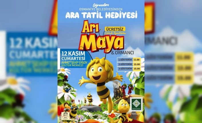 2022-2023 Eğitim Öğretim yılının ilk ara tatiline girmesine sayılı günler kala Osmaniye Belediyesi, ara tatil hediyesi olarak ücretsiz çocuk tiyatrosu etkinliği düzenleyecek. Ahmet Şekip Ersoy Kültür Merkezi’nde sahnelenecek olan çocuk tiyatrosu “Arı Maya ve Ormancı” 12 Kasım Cumartesi günü 11.00, 13.00 ile 15.00 saatleri olmak üzere üç seans olarak çocuklarla buluşacak.