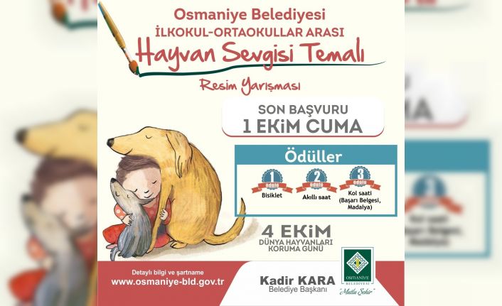 Dünya Hayvanları Koruma Günü etkinlikleri kapsamında Osmaniye Belediyesi tarafından ‘Hayvan Sevgisi’ konulu resim yapma yarışması düzenlenecek.