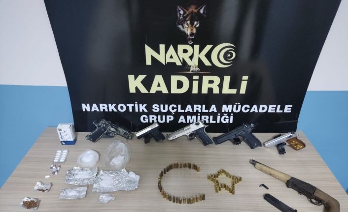 Adreste yapılan aramalarda 4 adet 7.65 mm ruhsatsız tabanca, 1 adet kurusıkı tabanca, 1 adet tüfek, 31 adet 9 mm fişek, 33 adet 7.65 mm fişek, 6 adet şarjör, 61.6 gram metamfetamin, 2 gr sentetik kannabinoit, 1.6 gram esrar, 16 adet uyuşturucu hap, 1 adet kelepçe ele geçirildi.