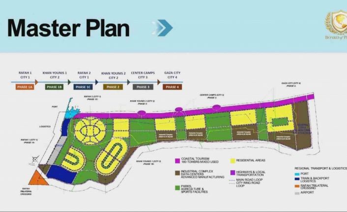 Kushner, yeniden inşa çalışmalarına yönelik ilk planlarından bahsederken, "Başlangıçta, özgür bir bölge ve ardından bir de Hamas bölgesi kurmayı düşünüyorduk. Sonra da, ‘hadi yıkıcı bir başarıya hazırlık yapalım’ dedik" ifadelerini kullandı. Dinleyicilere "Yeni Gazze" olarak adlandırdığı "ana planını" gösteren bir slayt gösterisi sunan Kushner, söz konusu plan kapsamında, konut geliştirme, veri merkezleri ve sanayi parkları için ayrılmış alanları gösteren renk kodlu bir haritayı detaylandırdı. Haritada Gazze Şeridi’nin yerleşim, kıyı turizmi ve karma kullanım bölgelerine ilişkin planlar yer aldı.