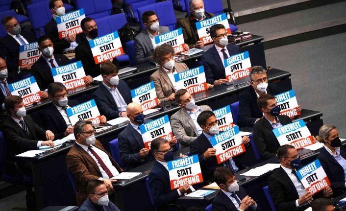 Almanya Başbakanı Olaf Scholz’un meclis oturumunda “Aşı mecburi hale gelmeli” sözleri esnasında konuşmasını kesen Almanya için Alternatif Partisi (AfD) vekilleri pankart açarak Scholz’u protesto etti.