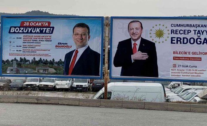 Erdoğan ve İmamoğlu, bir gün arayla Bilecik ve bazı ilçelerini ziyaret edecek. Cumhurbaşkanı Erdoğan’ın bugün, Belediye Başkanı İmamoğlu’nun ise yarınki ziyaretleri öncesi birçok bilboardda ilanlar yayınlandı. Bozüyük ilçe merkezinin yanı sıra Bilecik il merkezinde de olduğu belirtilen birçok bilboardda Erdoğan ve İmamoğlu’nun fotoğrafları yan yana yapıştırıldı, gezi programları hakkında bilgiler verildi.