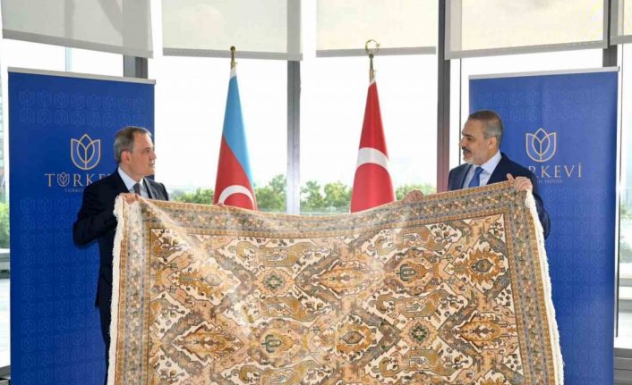 Azerbaycan Dışişleri Bakanı Ceyhun Bayramov, Türkevi’nde kullanılmak üzere Dışişleri Bakanı Hakan Fidan’a Karabağ halısı hediye etti.